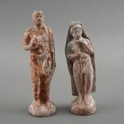 Twee aardewerk beelden: mannen uit Noord-Afrika of het Midden-Oosten, met resten van beschildering -één hoofd gelijmd-, 20,5 cm hoog