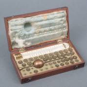 Hydrometer, uitvoering Dring & Fage, Londen, in mahonie kistje met winkeliersmerk van Clarkes -thermometer incompleet-, 5 × 23 × 12 cm