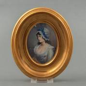 Ovaal portretje in verguld houten lijstje: vrouw met witte muts en blauw lint, onduidelijk gesigneerd, 19,5 × 17 cm