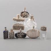 Acht glazen en kristallen parfumflacons, deels met zilveren monturen