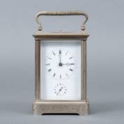 Metalen reiswekker met witgeëmailleerde wijzerplaat, eind 19e eeuw -gebruikssporen-, 14,5 × 9,5 × 9 cm