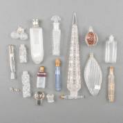 Diverse glazen en kristallen parfumflacons, waaronder 'Oxford Lavender', 19e en 20e eeuw -gebruikssporen, deels incompleet-, grootste 28,5 cm