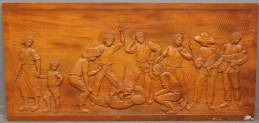 Groot houtsnijwerk: hanengevecht met omstanders, tweede helft 20e eeuw -hout wat gescheurd rechts-, 101 × 213 cm