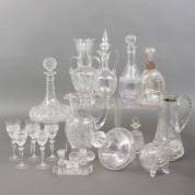 Divers geslepen kristalglas, waaronder: knijpfles met verzilverd montuur, karaffen, en vijf wijnglazen