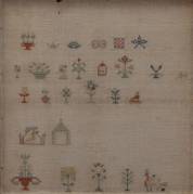 Merklap geborduurd door Plonia van Stigt geboren in 1750 te Dordrecht. Zij heeft dit geborduurd voor haar 15e jaar. De afstamming tot 1965 is vermeld op de achterzijde van de lijst, lijst 27,5 × 27,5 cm