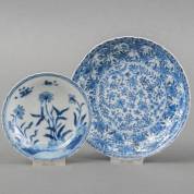 Twee diverse Chinees porseleinen schoteltjes met blauw-witte decors: één met vlinders boven bloem -haarlijn-, de ander bloemen in cartouches -gekramd-, beide Kangxi, grootste Ø 16 cm