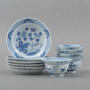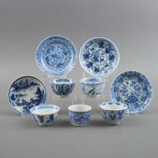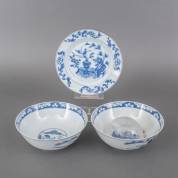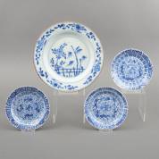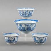 Vier Chinees porseleinen kommetjes en schoteltjes met verschillende blauw-witte decors, daarbij: bakje met transferdecor, 19e eeuw -defecten-