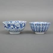 Chinees porseleinen gelobde kom met blauw-wit floraal decor, onderin afwisselend konijnen en bloemen, gemerkt, 18e eeuw -barst, haarlijn-, 7 × Ø 14 cm, en Chinees porseleinen gelobde kom met blauw-wit floraal decor, Kangxi gemerkt, 19e eeuw -randbeschadigingen-, 6 × Ø 13 cm