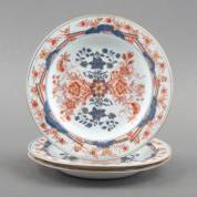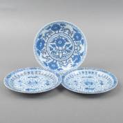 Drie Chinees porseleinen borden met floraal decor, Kangxi -één gelijmd-, Ø 22 cm
