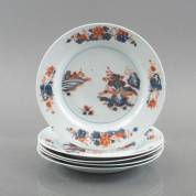 Vijf Chinees porseleinen Imari dubbelborden met landschapsdecor, midden 18e eeuw -één gelijmd, twee met bodembarst-, Ø 25,5 cm