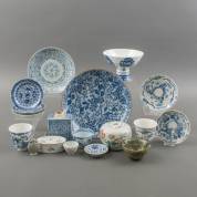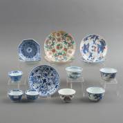Divers Japans en Chinees porselein: vijf kommetjes met zes deksels en acht schotels, daarbij: zeven diverse losse schotels -defecten-