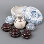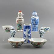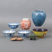 Drie Chinees porseleinen kommen met blauw-wit floraal decor, Chinees porseleinen voorraadpotje met roodbruin floraal decor, groengeglazuurd inktpotje, rond keramiek doosje met reliëfdecor, Chinees porseleinen kom met floraal decor op geel fond en Europees keramiek blauwgeglazuurde dekselpot, hoogte Europese dekselpot 20 cm