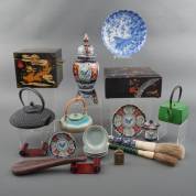 Diverse Aziatica, waaronder: gietijzeren theepotten, modern VOC-porselein, en lakwerk kistje