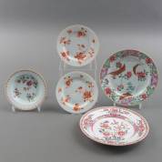 Chinees porseleinen famille rose bordje, Ø 16 cm, Chinees porseleinen famille rose bord, Ø 22,5 cm, Frans porseleinen famille rose bord, uitvoering Samson, Ø 23 cm, en twee Chinees porseleinen melk-en-bloed bordjes, Ø 16,5 cm -defecten-