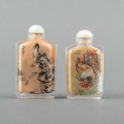 Twee Chinese glazen snuifflesjes met achterglasschilderingen: figuren in rotsachtig landschap, en fazanten, beide met natuurstenen dopje, 20e eeuw -het exemplaar met landschap heeft een verticale kras-, 9 × 5 × 2 cm, herkomst: particuliere verzameling Amsterdam