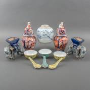 Divers kleingoed, bestaande uit: twee Japans Imari dekselvazen, Chinees porseleinen gemberpot, drie Chinees porseleinen kommetjes met lepels en paar keramische olifanten -gebruikssporen-, gemberpot 16 × Ø 15 cm