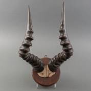 Hartenbeestgewei (antilope) op houten achterplaat, 35 × 27 × 23 cm