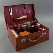 Bruin lederen toiletkoffer met rood lederen binnenbekleding waarin diverse compartimenten met flacon, diverse borstels, doosjes etc., met initialen, uitvoering John Pound & Co Ltd., Engeland, eerste helft 20e eeuw -gebruikssporen-