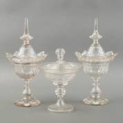 Paar kristallen gembercoupes met olijfslijpsel -chips-, en dekselcoupe met geslepen plantendecor -chips-, alle 19e eeuw, hoogte gembercoupes inclusief deksel 41 cm