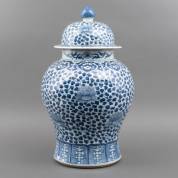 Drie blauw-witte keramische dekselpotten, en een potje met craqueléglazuur, Azië, alle modern, grootste 12 × Ø 23 cm