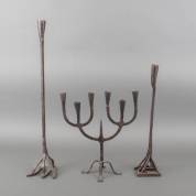 Paar smeedijzeren brandijzers, initialen FA en M of W, te gebruiken als kandelaars, daarbij: een zesarmige smeedijzeren kandelaar, langste brandijzer 71 cm