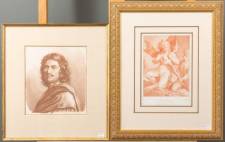 Twee ingelijste prenten: twee putti steken de knots van Hercules aan, naar een tekening van Guido Reni, destijds in de collectie van The Earl of Bute, voorzien van een gedicht, stippelgravure, uitgegeven in 1777, 22,5 × 17,5 cm, en portret van Nicolas Poussin, uit het boek 'Recueil de têtes et de figures, Choisies dans les plus beaux tableaux de N. Poussin', stippelgravure, begin 19e eeuw, 21 × 18,5 cm