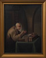 Hollandse School: geleerde die zijn pen snijdt, olieverf op paneel, naar Gerard Dou, 30 × 23 cm