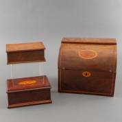 Mahoniegefineerd brievenkistje met inlegwerk van een bloem in het deksel -defecten-, vogeloogesdoorngefineerd brievenkistje, en vogeloogesdoorngefineerd sigarenkistje met inlegwerk in het deksel, afmetingen grootste 24 × 27 × 18 cm