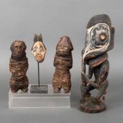 Twee ingebonden Afrikaans houten beeldjes met kralenkettingen, Zigua, Tanzania, klein Afrikaans houten maskertje op standaard, Punu, Gabon, en een zittend houten beeld met zwart-witte beschildering, Sepik, Papoea-Nieuw-Guinea, laatstgenoemde 37 cm hoog