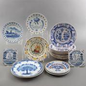 Diverse Delfts aardewerk: 18e-eeuwse borden -randschades-, 20e-eeuwse memorieborden en dergelijke, waaronder uitvoering De Porceleyne Fles, en twee tegels