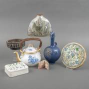 Divers kleingoed, waaronder: porseleinen theepot met verguld en blauw decor, dekseldoosje, uitvoering Capodimonte -defecten-, aardewerk schaal, uitvoering Kay Klinge, Denemarken, en een blauwgeglazuurd aardewerk jenevervaasje van P. Hoppe, Schiedam, begin 20e eeuw, laatstgenoemde 26 × Ø 13,5 cm