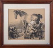 Richard Harry Carter (1839-1911), paard bij de hoefsmid, houtskool en wit krijt op papier, r.o. gesigneerd en gedateerd '98, 34 × 40 cm
