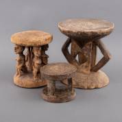 Drie Afrikaanse houten krukjes, Ghana, tweede helft 20e eeuw -gebruikssporen-, hoogte grootste 28 cm