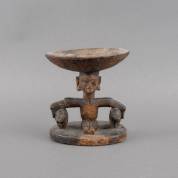 Afrikaanse houten kariatide kruk, de steun is een zittend figuur met twee varkens onder de armen, Luba, Democratische Republiek Congo -gebruikssporen-, hoogte 18 cm