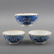 Drie Delfts aardewerk kastkommen met blauw-wit 'pauwendecor', eind 18e eeuw -defecten-, grootste Ø 19 cm