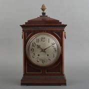 Tafelklok in mahonie kast met messing biezen, de verzilverde wijzerplaat met Arabische cijfers, slagwerk op gong, eind 19e eeuw -gebruikssporen-, 50 × 28,5 × 17,5 cm, inclusief slinger en opwindsleutel
