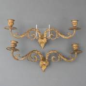 Paar verguld messing tweelichts pianokandelaars met bladmotieven