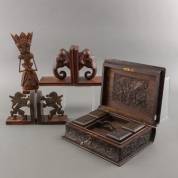 Paar houten boekensteunen in de vorm van olifantshoofden, houten Sitra beeld met resten van polychromie, Bali, Indonesië, houten kaartdoos met gestoken decor van pauw en bloemen, Indonesië, en paar houten boekensteunen met metalen staande leeuwen -slagtanden ontbreken, kleine defecten-, doos 9,5 × 31 × 23 cm