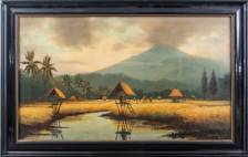 Frederik Kasènda (1891-1942), zicht op de Merapi vulkaan vanuit de rijstvelden, olieverf op doek, r.o. gesigneerd en gedateerd 1932 -kras-, 60 × 103 cm