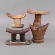 Vier Afrikaanse houten hoofdsteunen: Dogon, Mali, Bakuba, Democratische Republiek Congo, Orono, Ethiopië, Adhanti, Ghana -gebruikssporen-, hoogte Orono steun 17 cm