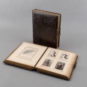 Twee fotoalbums. 4to. Blindgestempeld leder, messing klamp; één album met 24 portretfoto's door Engelse fotografen