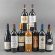 Negen diverse flessen wijn, waaronder: Bordeaux, Bolgheri en Sauternes -vulniveau Bourgogne 3,5 cm, de rest base neck-