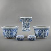 Divers blauw-wit porselein: vaas, paar cache-pots en paar dekseldoosjes, modern -cache-pots met aanslag-