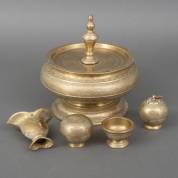 Messing sirih-set met gegraveerd bloemdecor en diverse attributen voor de consumptie van betelnoten, Indonesië, 23 × Ø 23 cm