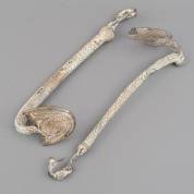 Twee bronzen haken bekroond door vogel, mogelijk Benin, grootste 42 × 14 cm