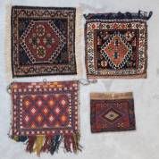 Drie Perzische tasjes en een tapijtje, waaronder Kaskay, afmetingen tapijtje 56 × 63 cm
