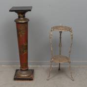 Metalen plantentafeltje en beschilderde houten en metalen piëdestal -gebruikssporen-, hoogte 75 en 99 cm