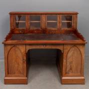 Mahonie bureau met opstand, waarin laatjes en beglaasde deurtjes, het onderstel met spitsbogen in de deuren, circa 1840 -kleine defecten, waaronder aan ladetrekkers, bekleding blad en fineer-, 124 × 141 × 70 cm