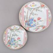 Twee Chinees porseleinen famille rose schotels met bloem- en bamboedecor, één grote en één kleinere, Qianlong -de grote gerestaureerd: was ooit doormidden gebroken; de kleine met randrestauratie-, Ø 40 en 29 cm