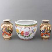 Chinees porseleinen vissenkom, en paar Japans porseleinen Satsuma vazen, alle 20e eeuw, vissenkom 28 × Ø 38 cm